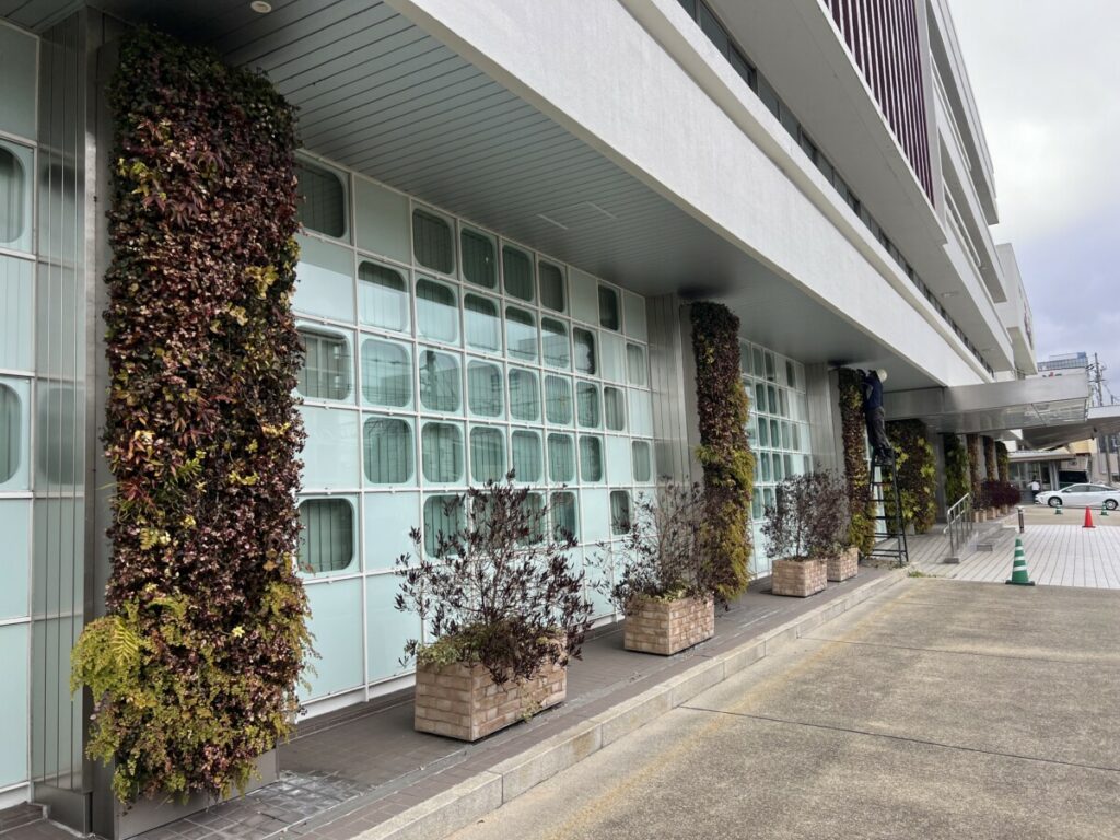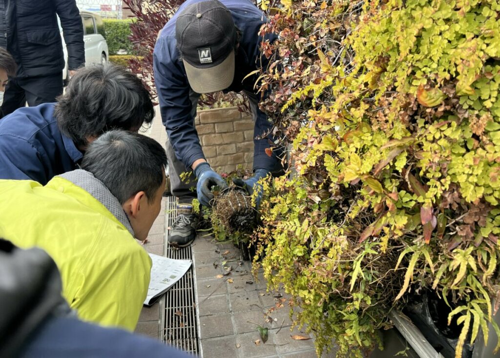 そこで今回の授業では、「屋上・壁面緑化」をテーマに設定。伊藤商事様の「カセット式壁面緑化システム」を導入されているタキイ種苗様のご協力のもと、現地での実地見学を行いました。