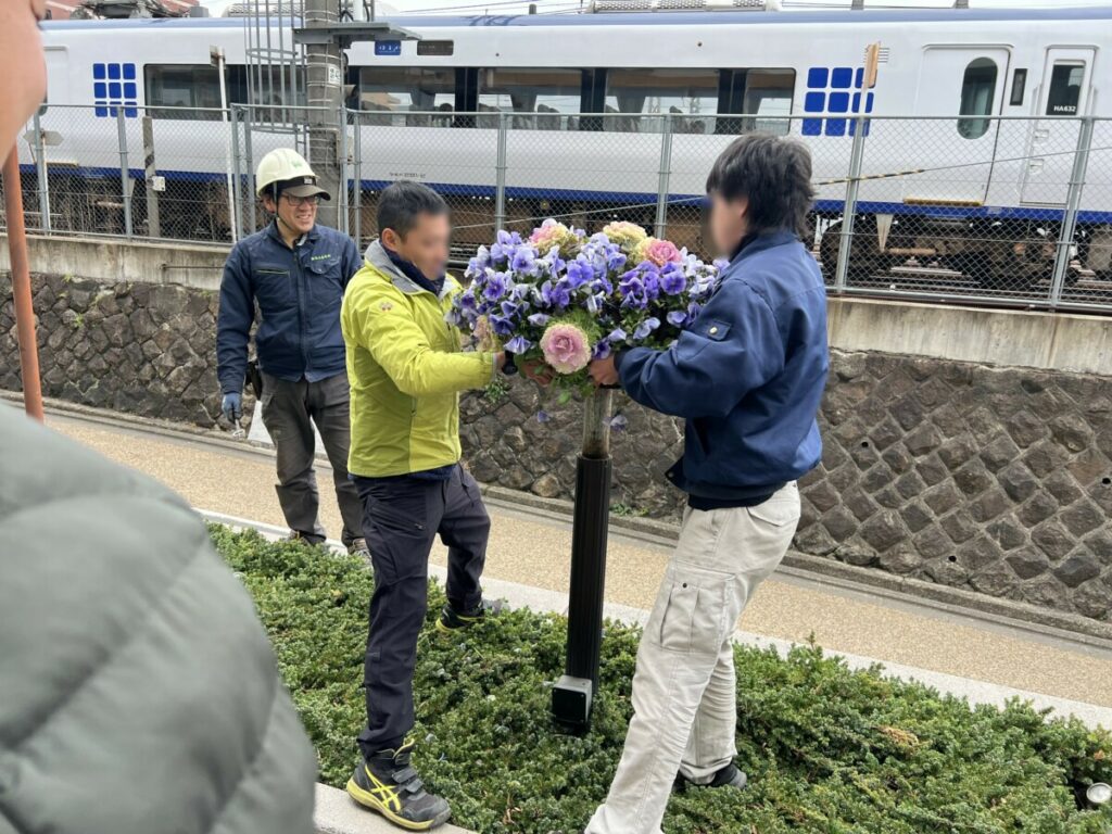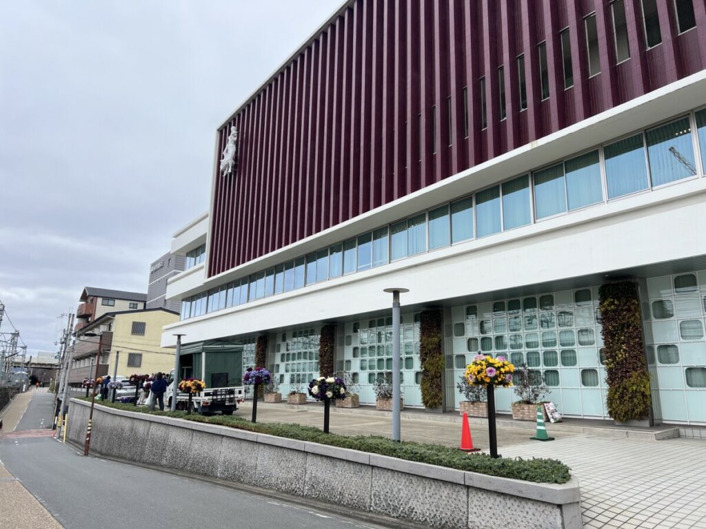 タキイ種苗様の正門付近には、華やかな「スタンディングバスケット」も設置されています。ここは京都駅を通る電車からもよく見える、いわば「企業の顔」となる場所。