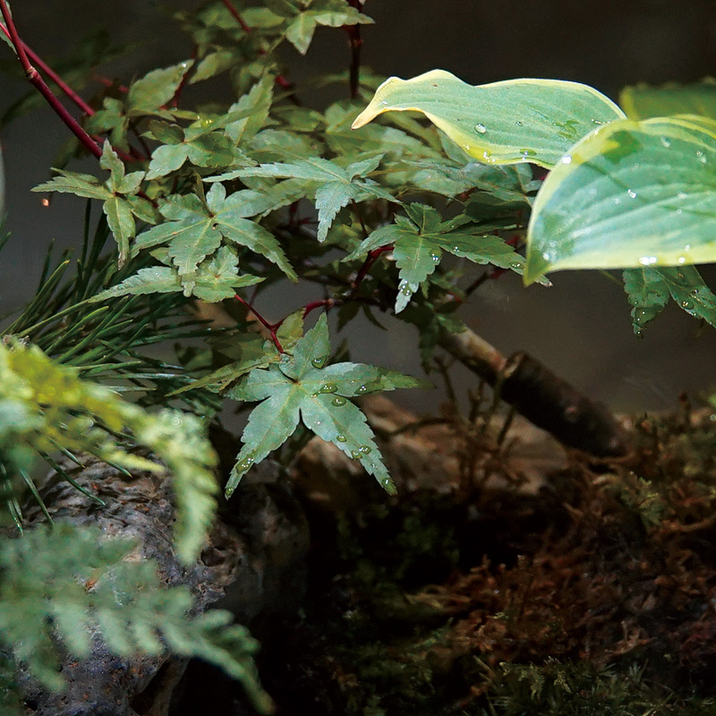 初めての制作ということもあり、「屋外の植物は本当に向いていないのか?」という疑問もありました。そこであえて、杉やモミジの盆栽を入れてみることに。